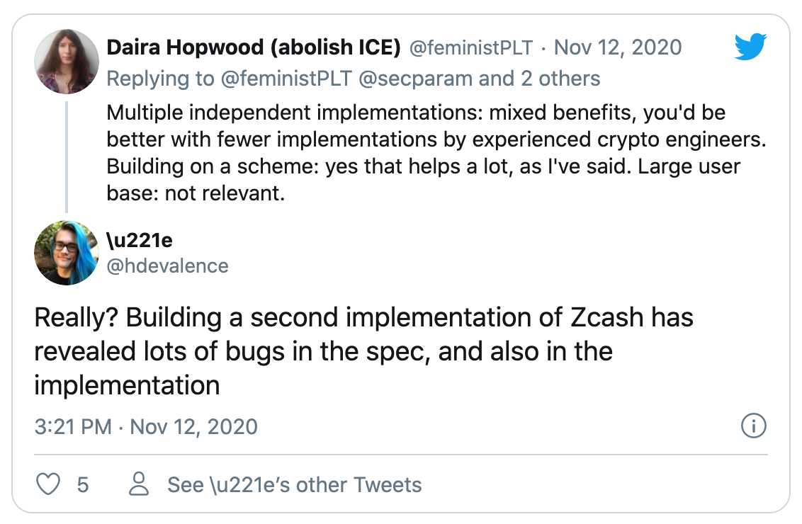 Ian Miers once said something like that: “you need time, expertise, and meaningful engagement”. I like that sentence, although one can point out that these traits are closely linked–you can’t have meaningful engagement without time and expertise–it does show that finding bugs take “effort”.