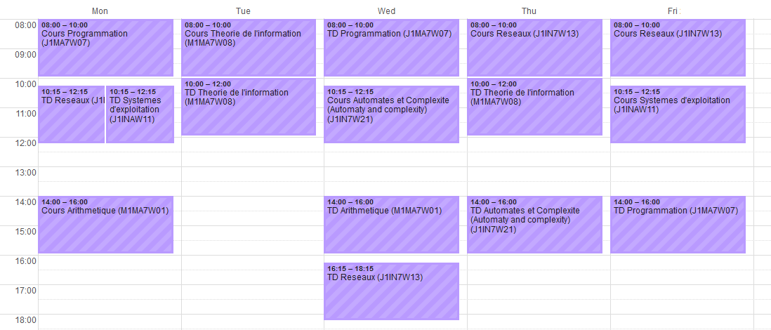 The only course I had to choose, but we didn’t have much choice since they removed half of the available courses including the one I wanted to take (Probability). The course is taught by… it’s a rapid introduction about network concept. I’m not really into it, it speaks too briefly about many things, some are interesting, some are not. I was supposed to have an application class but apparently our professor fell asleep on his way (he’s narcoleptic).